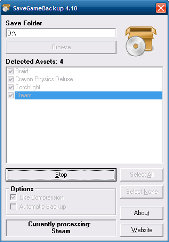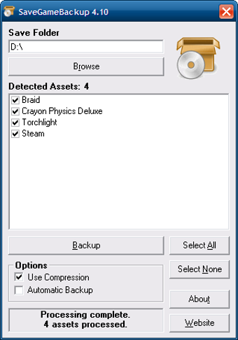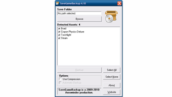 SaveGameBackup consta de una sola ventana, en la cual solicita la ruta de guardado de las copias, muestra casillas para cada juego y ofrece un par de opciones: copia automática y compresión de los archivos. Para iniciar el guardado, haz clic en el botón Backup.